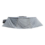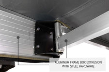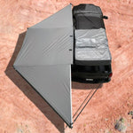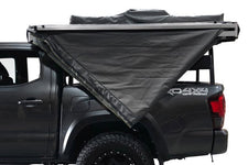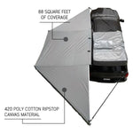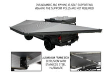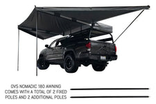 Universal 180° Nomadic Dark Gray Awning (18069909) by Overland. With Black Transit Cover. Covers are manufactured out of 280G poly cotton rip stop material that has heat sealed seams which ensure you're not going to see any leaks through seams regardless of the size of rain you're dealing with. If you see the weather changing or something stronger than a breeze turns up, you can deploy the three pivoting aluminum poles and adjust to your desired height with a quick lock system in seconds.