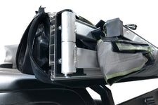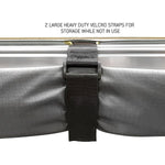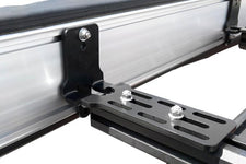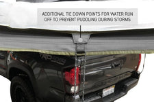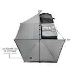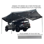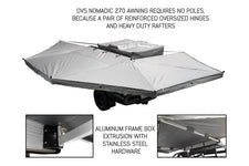 Universal Driver Side 270° Nomadic Dark Gray Awning (18079909) by Overland. With Black Transit Cover. When you're looking for a quick deploying one-man operation awning that gives you 129 square feet of shelter you came to the right place. Unlike other awnings, Nomadic 270 requires no poles to set it up because of the pair of reinforced oversize hinges and heavy-duty rafters. Covers are manufactured out of 600D poly cotton rip stop material that has heat sealed seams which ensure you're not going to see any leaks through seams regardless of the size of rain you're dealing with. If you see the weather changing or something stronger than a breeze turns up, you can deploy the three pivoting aluminum poles and adjust to your desired height with a quick lock system in seconds.