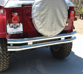 Fits 76-83 Jeep CJ-5 76-86 Jeep CJ-7 81-85 Jeep CJ-8 97-06 Jeep Wrangler (TJ) 87-95 Jeep Wrangler (YJ) 04-06 Jeep Wrangler Unlimited (TJ) 304 stainless steel Polished to a mirror finish Robotically welded One piece design 2" receiver hitch Each of these Rampage tube bumpers is robotically welded to exacting specifications to ensure long life and continued good looks. The black finish bumpers are specially treated with a dense zinc undercoating before being put through a dual powder coat painted finish. The bright stainless version begins with the highest quality 304 stainless steel, which is polished to a mirror finish. These tube bumpers have a welded one-piece design for extreme durability.