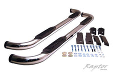 Autopartstoys.com offers you the Raptor 3" nerfstep bars. Raptor Series offers durable molded step pads with each step bar. This prevents water from staying under and getting caught in the step bars. These high quality step bars are made for traction, durability and ease of use for entry and exit your vehicle. Manufactured using marine grade stainless steel, Raptor 3" nerfstep bars are highly polished to prevent rust for years of lasting use. These step bars cover the full length of your cab. Easy installation no drill required, no special tools. Raptor Series step bars provides simple bolt-on installation with included mounting hardware manufactured to fit your specific vehicle.