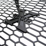 Stealth Laser X Grilles add a modern update to the traditional X-Metal Grilles with the upgraded laser cut steel 1-piece construction and blacked out design. The main grille design features a unique repeating €œHoney Comb€� pattern and the black X-Metal studs and badging are prominently displayed on the black powdercoated mild steel. Laser X Grilles are available with chrome studs as well (Laser X Series). Our uncompromising quality begins with advanced 3D CAD supported engineering and design. All our products undergo rigorous testing for fit, finish, drivability and durability. Each part starts with a custom jig using laser cut materials, precision TIG welding and meticulous assembly and quality control. This dedication of American craftsmanship shows in every product that leaves our facility in California. All our black powder coated grilles go through a multi-stage process, first they are sandblasted to prepare the surface for our epoxy primer base coat. Second, they are cleaned to remove contaminants from the sandblast process. Then an epoxy primer base coat is applied and cured to seal the entire surface, finally the color top coat is applied over the primer and cured to provide long lasting protection and a high-quality OEM finish.
