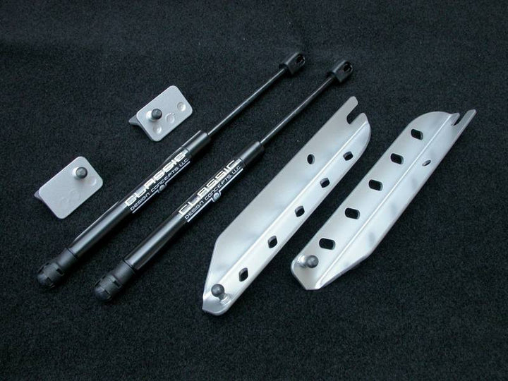 - The gas-charged struts are OEM quality and the laser cut steel brackets are powder coated in silver.