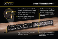 Designed for Performance. Each Stage Series Light Bar has been engineered from the ground up to provide more output than any other light bar on the market. The TIR optics capture and focus nearly all of the light output, shining it only where you need it, without glare or wasted light.