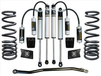 2003-2012 Ram 2500/3500 2.5 Inch Stage 2 Suspension System is our performance system for the novice off road enthusiast. This system not only levels out the stance, it increases ride quality and performance both on and off road. The Stage 2 System is comprised of dual rate coil springs, polyurethane bumpstops, sway bar, 2.0 Aluminum Series remote reservoir shocks, and our bearing style adjustable track bar. Remote reservoir shocks will extend performance of the kit by increasing the duration of consistent damping regardless of situation. The adjustable track bar with FK bearings not only improves rigidity over flexible factory joints, but offers adjustability to center the front axle under the truck. This performance system is great for towing, rough construction site terrains, and country dirt roads all while keeping a smooth highway feel. ICON has spent endless hours testing and tuning our suspension components and shocks together, so you can rest assured you have the best suspension solution on the market.
