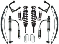 The Stage 10 system includes vehicle-specific tuned 2.5 Series Extended Travel coilover shocks equipped with ICON's CDC (Compression Damping Control) Valve. The easy-to-adjust CDC Valve allows for end-user compression changes to provide optimal ride quality across all types of terrain and vehicle cargo configurations. In addition, the coilovers feature a remote reservoir for exceptional cooling properties, ICON-engineered Eibach coil springs for superior vehicle “feel” through the range of travel, and are height adjustable from 0-3.5” of lift over stock for 2005-2015 models or 0-2.75" of lift for 2016-UP models, allowing the use of larger, more aggressive wheel and tire combinations. Used in conjunction with the included ICON upper control arm, these extended travel coilovers add increased droop travel to the front suspension. To increase the ride quality of the truck and gain additional droop travel, the ICON RXT multi-rate leaf springs are added to the rear. Designed with an additional leaf (included with kit) that can be exchanged or added to the pack to yield an additional 10-20% spring rate, this leaf spring is perfect for drivers seeking improved rear ride quality in an “unloaded” vehicle as well as those that are have outfitted their trucks with a significant amount of weight in the form of a bed rack, roof top tent, spare tires, parts, or other additions. To compliment this increase in rear wheel travel the Stage 10 system includes a unique 2.5 Aluminum Series remote reservoir Omega bypass shock that features a side-mount eyelet that making it shorter in collapsed length, longer at extension, and still fits in the factory mounting location. This shock combines vehicle-specific valving with compression and rebound adjustment giving end-users ultimate control of performance and ride quality while a large ten-inch remote reservoir was also added to aid in heat dissipation and resist shock fade during spirited driving.