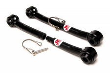 Originally developed by JKS in 1989, the swaybar "quick disconnect" enabled Jeep owners to temporarily disconnect the front swaybar from the axle for maximum off-road suspension performance. The amount of additional suspension travel gained with the front swaybar disconnected was dramatic - at least 30% in most cases. This proved more than enough to ensure constant contact between tires and terrain in the majority of off-road situations. Furthermore, JKS discovered that rear suspension performance also improved off-road when the front swaybar was disconnected. Without any modifications, the smaller less-restrictive rear swaybar could operate more effectively due to the additional leverage created by the front suspension. Swaybar Quick Disconnect; Front; Quick-release swaybar end link; Fixed length; Attaches to swaybar and axle housing; Bolt-on; Pair