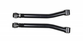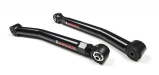 JKS Manufacturing Forged Series Adjustable Control Arms. These new arms follow a traditional Jeep adjustable arm design utilizing a forged adjustable flex end and jam nut setup for adjusting the length. The forged end is fully rebuildable and greaseable. 1-1/4"-12 threads provide ultimate strength and fine-tune adjustability. The arms are made from DOM tubing and incorporate a unique hex shaped weld-in threaded bung for easy tightening of the jam nut. The arms also feature factory style rubber bushings at the non-adjustable ends for quite, maintenance-free operation. All arms are CNC formed for proper tire, frame and axle mount clearance. The durable and sleek all-black paint scheme provides a clean look. The small JKS oval decal lets everyone know you bought the best. All arms are designed for lift heights of 0-6". These new kits are a great together or as a complement to the JKS adjustable rotating arms in most any existing suspension system. J-Flex Adjustable Length Lower Control Arm; Front; Adjustable length suspension link; DOM Steel tube body; Powder Coated; Bolt-on; Pair