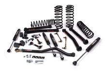 Upgrade your Jeep® Wrangler JL 4 Door with a J-Konnect 3.5" suspension system to fit larger tires and increase off road capabilities. The J-Konnect kit includes dual rate coil springs, tuned gas shocks, adjustable front track bar, J-Link lower control arms, and sway bar Quicker Disconnects. While the entry level J-Venture systems is designed for equal parts on-road handling and off-road capability, J-Konnect takes strength and performance a step further by adding front and rear fixed length J-Link lower control arms. These lower control arms not only add front caster and rear wheelbase, they are a serious upgrade to the strength over the factory control arms. Built 2” x .250-wall DOM tubing while offering better NVH isolation with large factory style rubber bushings at both ends. The end result is aggressive off-road performance and strength while maintaining excellent on-road manners. Get connected with J-Konnect.