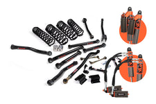 Designed for maximum articulation, improved strength, and adjustability, these complete J-Krawl systems are available for next-level performance. Components include J-Flex upper and lower control arms, Jspec dual-rate coil springs at each corner designed to level out the stance, and premium FOX 3.0 Factory Race Series remote reservoir internal bypass shocks all the way around to match your performance needs. Internal bypass position-sensitive and race-inspired damping technology gives you the feeling of endless travel by smoothly ramping up control of both bottom- and top-out extremes while floating over obstacles in the ride zone. External compression adjusters allow you to quickly adapt the shocks to a wide variety of terrain and vehicle loads. Also included is an adjustable front track bar, quicker disconnect front sway bar end links, rear sway bar links, and bump stop extensions. J-Krawl builds off Jeep€™s factory suspension mounting points and upgrades everything front to rear. Adjustability is important for fine-tuning suspension geometry. J-Krawl delivers. Dial-in front caster, rear pinion, and overall vehicle wheelbase. The JKS Engineering team spent a lot of time dialing in the FOX shock valving and spring rates to suit J-Krawl's combination of parts as well as oversized wheels and tires. You'll be impressed with the stability and compression/rebound response. Take your Jeep's off-road performance and strength to the next level. It should be noted that an aftermarket front driveshaft is strongly recommended due to potential additional travel.
