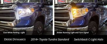 Time for an upgrade! This halo kit, designed specifically for the 2014+ Toyota Tundra, includes custom-sized C light accents with multiple functions that will add a distinct, unique look to your vehicle both day and night! When installed on STANDARD headlamps (no factory LED): this LED will illuminate a brilliant amber as DRL, extremely bright white when headlamps are turned on, and flash amber when the turn signal is engaged