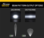 The Driving pattern was designed to supplement your high beams. Rather than a simple spot pattern, the Stage Series Driving pattern has a rectangular 20Wx8H degree pattern that is far more useful for directing light downrange at high speeds.