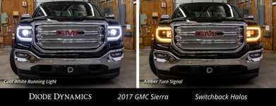 Time for an upgrade! From the factory, the Sierra comes with a white C-shaped DRL that from certain angles can look segmented and distorted. Diode Dynamics is excited to release our HD LED Halos for the 2016-2018 GMC Sierra that provides a much brighter, more uniform appearance compared to the factory optics. These computer-designed LED Halos are circuit boards that align perfectly behind the factory diffusing reflector. Available in switchback and amber-only, both versions also function as an additional front turn signal for a custom, yet functional look!