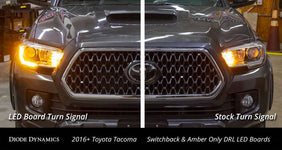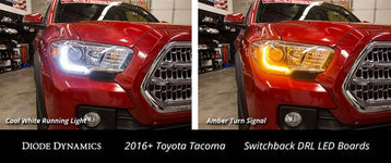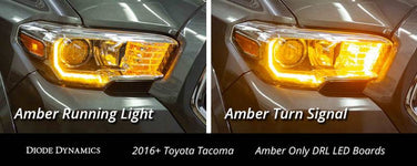 Time for an upgrade! From the factory, the Toyota Tacoma has LED accents in the headlight that illuminate in a white color, for the parking light and DRL. Available in switchback and amber-only, Diode Dynamics replacement LED boards add a brighter DRL and additional amber turn signal for a custom, yet functional look. Your order includes two sets of LED boards, one for each side of the vehicle.