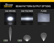Functional Patterns. All Stage Series beam pattern options were designed with optical simulation modeling, to shape the output in a highly-functional beam pattern. No matter what your auxiliary lighting needs are, there is a Stage Series optic for you! The Driving pattern was designed to supplement your high beams. Rather than a simple spot pattern, the Stage Series Driving pattern has a rectangular 20Wx8H degree pattern that is far more useful for directing light downrange at high speeds.