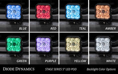 Selectable Backlight. The Stage Series 5inch LED Pods Includes in the White kit feature a selectable backlight with eight different color options perfect for an extra styling accent or for more visibility when you're not using the main beam. Selecting your backlight color is easy - simply alternate the power on and off. There's no complicated programming with a controller! The SS5's backlight fully illuminates the TIR optic providing unique accent lighting that you won't find on other LED pods. Note: Due to the yellow lens the Yellow kit is only available with an Amber backlight color.