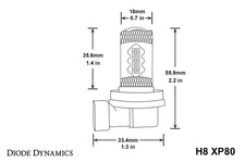 Upgrade. Add more light output and a modern appearance to your vehicle with the H8 XP80. Populated with twelve side-firing 5W-rated LED chips and four forward facing 5W-rated LED chips, this is the brightest self-contained automotive LED bulb on the market. Housed in an aluminum casing with a textured finish for maximum heatsinking properties, the XP80 will last for years to come. Best of all, installation only takes minutes - simply take out your factory bulb and the XP80 will fit snugly in the socket.