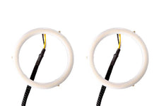 All input wires activate the halos, at different brightness levels. All amber-colored halos ship with low priority drivers. This means that if both low and high power inputs are powered, the LED will light up with low power level. This is convenient for connecting the red wire to a parking light or DRL signal, for use during the day as a high-power DRL. Then, if the white wire is connected to the headlamp power, they will dim down at night. If the yellow wire is powered at any time, the halo will light up at 200 percent brightness momentarily, intended for signalling (dims automatically if powered for more than two seconds).