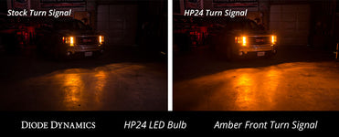 By using this dual-filament design, along with the embedded digital timing circuit, you can upgrade this look: the HP24 lights up in a 6000K cool white color when your headlights are turned on, and flashes amber when the turn signal is activated. When you switch the turn signal off, it switches back to white. This allows you to upgrade your front end to an all cool white appearance, while still keeping your turn signal functionality. The HP24 bulb is only suitable for vehicles that have a clear front turn signal reflector lens.