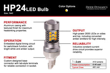 Upgrade. Add dual color functionality and a modern appearance to your front turn signals with the 7443 HP24 turn signal bulb. Populated with sixteen amber chips and eight white chips, this bulb lights up white when your headlights are turned on, and flashes amber when the turn signals are activated. Housed in an aluminum casing for maximum heatsinking properties, the HP24 will last for years to come. Best of all, installation only takes minutes - simply take out your factory bulb and the HP24 will fit snugly in the socket.