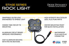 Introducing the Stage Series Rock Light from Diode Dynamics! Thanks to high-intensity automotive-grade LED chips placed on an aluminum circuit board the Stage Series Rock Light provides an unmatched 10 watts of power and 1000 lumens of light output making it the brightest rock light on the market! These rock lights are perfect for lighting up your wheel wells truck bed under your hood on your roof rack and more - the applications are endless!