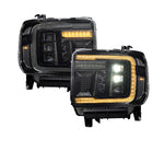 Overview. With upgraded LED headlights compatible with GMC Sierra 1500/2500/3500 2014+ from Form Lighting, you can add full functionality to your truck, with a number of modern features. Using three bi-LED projectors, these lights produce higher intensity and output of high and low beams.