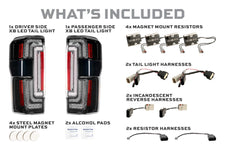 Accessories: 4x Magnet Mount Resistors, 4x Steel Magnet Mount Plates, 2x Tail Light Harnesses, 2x Resistor Harnesses, 2x Halogen Reverse Harnesses, 2x Alcohol Pads