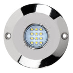 Marine Sport Lighting Stainless Steel LED Underwater boat lights function as transom lights and are also great for dock lighting. Use this durable LED boat light to add color to your wake, attract fish, or for nighttime swimming and diving. The LED housing is vibration and shock-resistant and is made from a solid piece of 316 marine-grade stainless steel with a shatterproof polycarbonate lens. These IP68-rated LED lights are completely waterproof, and intended exclusively for underwater use. The 60-Watt LED boat light is designed to last 50,000 hours, operates within a wide 9-32V DC range, and uses 18 High-Powered Cree LEDs. Installation hardware is included for surface-mounting on a variety of transom types.