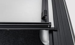 With LOMAX® Hard Tri-Fold Cover open and storage clips fastened, pull cords on front panel, slide tonneau cover back to release hooks, and lift to remove. To reinstall, slide tonneau cover forward to engage hooks and lower to automatically lock in retainment brackets.