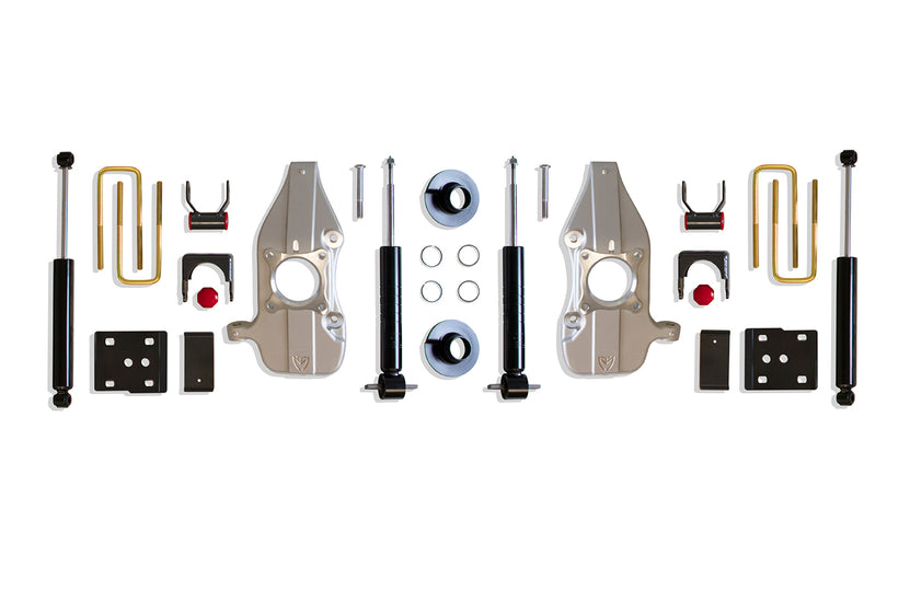 - Kits Is Comprised Of 2" Lowering Spindles Part# 103220, Adjustable Lowering Struts Part# 373203 & Rear Box Kit Part# 203250 (Flip Kit, Shackles & Rear Shocks)