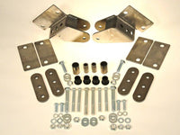 The M.O.R.E. Jeep CJ "through" the frame shackle reversal system is a bolt on and weld in construction with all hardware included. A shackle reversal system or "SRS" allows the front suspension to travel in a much more natural action when the spring compresses. The new front pivot brackets are fully welded, and ready to bolt into existing holes in your CJ frame. Spacer platesare provided for the purpose of different winch mounting possibilities, and/or if you choose to use our Frame Plates FP100 or FP300. The shackle plates provided in this system are 3/8" thick steel. This S.R.S. mounts the shackle through the frame. A hole must be drilled in the frame and then a tube welded in it, polyurethane bushings provided are then inserted into the tube and the shackles provided hang from each side of the frame. This method will not lift the Jeep. These "stubby" brackets gain you 1-7/8more clearance. Don't let that bracket hanging down hang you up on that rock. These Stubby brackets are shorter in height which gives you more clearance for those obstacle's. The front driveshaft will need to be modified with a long travel slip in stub. It will work with or without a lift kit, spring under or over the axles. Works with stock 2" wide leaf springs only.