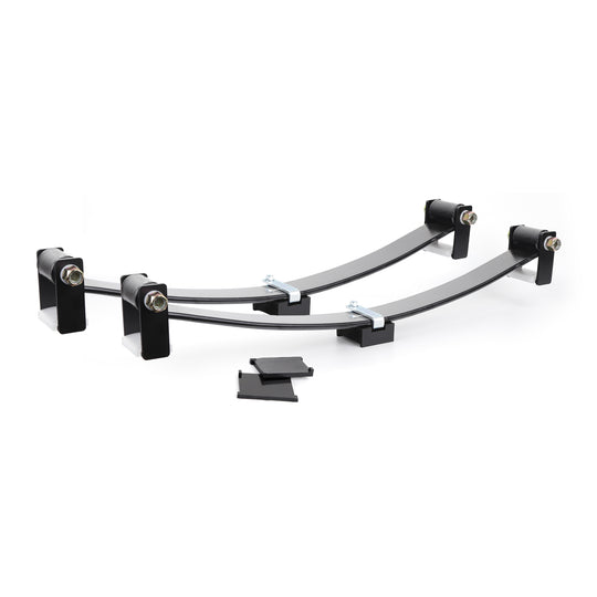 SuperSprings are a suspension stabilizing system for vehicles with rear leaf springs, designed to level loads and reduce body roll. SuperSprings provide users extra load support and reduce body roll without compromising ride quality. They are manufactured using a variety of different sized springs to support multiple applications. All SuperSprings are manufactured in the U.S.A. from SAE5160H high grade, shot peened steel.