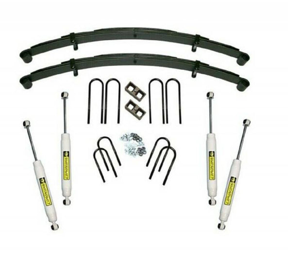 - Front leaf springs, shocks, rear block and u-bolt kit, and all hardware required specific to the 1973-1987 4WD Chevrolet/GMC ½ ton Pickup