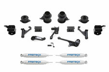 This high quality system has been designed to retain the factory load carrying capacity and ride of the vehicle with minimal parts. The stock coil springs are retained with angular steel spacers to retain the factory front spring bow. This is an important feature as Chrysler designed the bow to aid in their unique alignment specs and ride quality. Flat spacers do not provide this. The rear coil springs are also retained with steel spacers keeping the weight carrying capacity of the vehicle intact. A Fabtech exclusive on this system is the steel front bump extensions. They will not blow out like extra long urethane bump stops found in other aftermarket suspensions. No chance of spring and shock damage with the Fabtech steel extensions. The factory Radius Arms are relocated with heavy duty 1/4" thick steel brackets for proper caster with the 5" lift. Super stout front and rear Track Bar drop brackets center the axles under the vehicle with the new ride height.