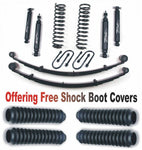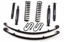 New front coil springs are supplied that are capable of handling anything! Since we design our coil springs for off road use, there is no need for bump stop extensions. Our coils can be smashed to the bottom and will always come back! No, that doesn't mean they are stiff. The key is using the correct size wire and quality material with the correct spring rate to offer the perfect ride and still hold up over time. The rear is lifted via new Zone Offroad leaf springs. Many hours of development and testing have finally produced a capable spring that we are proud to introduce to our lineup. The new springs are a 5 leaf pack with anti-friction pads and center leaf spacer plates between each leaf. This design greatly decreases leaf pack internal friction. These springs are designed to give 3in of lift and are also set up to give the max amount of compression travel before the shackle is limited by the rear portion of the body. This allows the springs to flatten out as much as possible, which translates to increased wheel travel. These are designed to flex, but can still hold up and handle your load of gear. Check out the install article published by Four Wheeler Magazine.