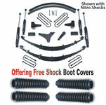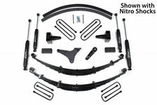 Zone Offroad 2000-2004 Ford 4wd 6in Suspension System. The newest offering for the leaf-sprung Super Duties is built around massive 9-leaf full height front leaf springs. The leaf springs thin, multi-leaf design provides a great ride while maintaining heavy-duty nature of the Super Duty. By making the springs out of 9 leafs we are able to keep the spring arch low which improves the ride. In addition, when the springs get loaded down, all of the leafs engage in a progressive nature and hold up to the added weight without sagging. To make the steering function as well as the springs, a dropped pitman arm and track bar relocation bracket are included. Bump stop relocation brackets keep the suspension from compressing too far and Nitro shocks keep the ride smooth and controlled. For the 2000-2004 models, the factory sway bar is retained, utilizing the factory mounts ability to be inflippedin at the frame. For 1999 models, new sway bar links are provided - which accounts for the slightly higher kit price. In the rear, full-height 5in blocks replace the factory components and add-a-leafs help get the last little bit of lift needed for a level ride stance.