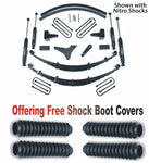Zone Offroad 1999 Ford Super Duty 4wd 6in Suspension System. The newest offering for the leaf-sprung Super Duties is built around massive 9-leaf full height front leaf springs. The leaf springs thin, multi-leaf design provides a great ride while maintaining heavy-duty nature of the Super Duty. By making the springs out of 9 leafs we are able to keep the spring arch low which improves the ride. In addition, when the springs get loaded down, all of the leafs engage in a progressive nature and hold up to the added weight without sagging. To make the steering function as well as the springs, a dropped pitman arm and track bar relocation bracket are included. Bump stop relocation brackets keep the suspension from compressing too far and Nitro shocks keep the ride smooth and controlled. For the 2000-2004 models, the factory sway bar is retained, utilizing the factory mounts ability to be inflippedin at the frame. For 1999 models, new sway bar links are provided - which accounts for the slightly higher kit price. In the rear, full-height 5in blocks replace the factory components and add-a-leafs help get the last little bit of lift needed for a level ride stance.