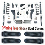 This new Zone Offroad 8in suspension system for the 2003-2007 1 ton and 3/4 ton Dodge Ram is performance packed and budget friendly for those looking to get 38in tires under their HD Dodge truck. The lift uses a unique control arm relocation design. Both the stock upper and lower arms are relocated to relieve angles, properly position the front axle and provide good caster and front pinion angle settings. The 1/4in steel constructed relocation brackets mount directly to stock locations and only require a few new holes to be drilled for extra support. No cutting of the frame or axle mounts is required. Stock alignment adjustability is retained. Stock control arm angles are maintained to provide a great ride, handling and control. In addition to the control arm brackets, all the necessary additional components are included. Full-length coil springs, dropped pitman arm, track bar relocation, sway bar relocation and bump stops are included. The rear kits feature new lift blocks and u-bolts. A rear carrier bearing drop kit is available also for trucks featuring a stock 2-piece rear driveshaft.