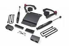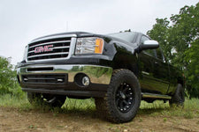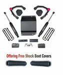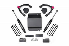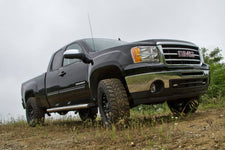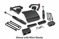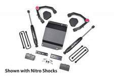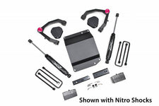 Zone Offroad 2007-2013 Chevy 1500 4wd 3.5in Adventure Series Lift System. Just like the Zone Offroad 1500 Ram Adventure Series Kits, this system is built around the Zone Offroad heavy-duty replacement upper control arms. Made from fully weld 1/8in steel plate construction as well as CNC machined ball joint and bushing mounts, these arms dwarf the factory components. In addition to overall strength of construction, the new arms trump the factory components by providing more range of motion. The arms utilize high quality MOOG brand ball joints that can handle heavy duty use and work in conjunction with OE-style rubber mount bushings to provide a quiet ride. The ball joints are greaseable and easily replaced with readily available parts at the end of their service. Proper brake line attachment points are included on the arms where needed for a factory-like fit. Matching the construction and quality of the new UCAs is a fully integrated front differential drop and differential skid plate system that relocates the differential for optimal driveline angles. The included strut spacers provide a full 3.5in of lift and install easily on the factory struts without the need of a strut compressor. In order to match up rear with the newly lifted front, a 3in block and u-bolt system is included that replaces the factory 1in block to net 2in and provide an overall level vehicle stance. The choice of standard hydraulic or Nitro rear shocks rounds out the kit.
