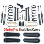 This Zone Offroad 4-link system replaces the weak upper and lower factory control arms with greasable DOM tubular arms. the arms mount in the factory control arm pockets for a completely bolt on easy installation that aligns to factory specs. Zone Offroad has engineered their coil springs for a comfortable ride on both gas and diesel trucks. Custom valved hydraulic shocks are included for a great ride, or choose the black nitrogen gas charges shock for that performance handling feel. To correct the steering geometry and keep your axle centered, the kit includes a dropped pitman arm and 1/4in thick fabricated track bar bracket that you will not be disappointed with! The kit also includes sway bar drop brackets and if you get serious, taller bump stops. The rear is lifted with 3in blocks to give your truck a more level stance and make for a quick installation.