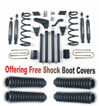 This Zone Offroad 4-link system replaces the weak upper and lower factory control arms with greasable DOM tubular arms. The arms mount in the factory control arm pockets for a completely bolt on easy installation that aligns to factory specs. Zone Offroad has engineered their coil springs for a comfortable ride on both gas and diesel trucks. Custom valved black nitrogen gas charges shock for that performance handling feel. To correct the steering geometry and keep your axle centered, the kit includes a dropped pitman arm and 1/4in thick fabricated track bar bracket that you will not be disappointed with! The kit also includes sway bar drop brackets and if you get serious, taller bump stops. The rear is lifted with 3in blocks to give your truck a more level stance and make for a quick installation.