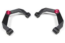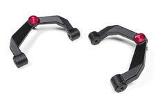 These new upper control arms are direct replacements for the factory arms, offering improved suspension travel and ride quality over the factory control arm design. Our heavy duty, boxed steel upper control arms are made from fully welded 1/8in steel plate construction as well as CNC machined ball joint and bushing mounts, dwarfing the strength of the factory arms while improving the performance and appearance of your HD's suspension. By repositioning the relationship between the arm and the factory droop limiter at the frame these arms will allow for more droop travel, while also resulting in a more neutral upper ball joint operating angle for leveled and lifted suspensions. Our fabricated arms utilize high quality Raybestos brand ball joints that can handle heavy duty use and work in conjunction with OE-style rubber mount bushings to provide a quiet ride. The ball joints are greaseable and easily replaced with readily 10 parts at the end of their service life. These UCAs were designed for 2-3in leveled setups and have been approved for fitment on Zone Offroad's 5in Suspension System for the 2011-19 HDs. They may work with other suspension setups but a fitment check with the suspension at full droop is highly recommended to ensure the suspension travel is properly limited with the use these arms.