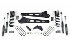 Zone Offroad 2013-17 Ram 3500 4.5in Radius Arm Suspension Lift System. The new Ram 3500 gives new meaning to inHeavy-Dutyin. Holding true to that we have developed a lift system centered around two new massive radius arms to replacement the factory arms. The new arms are fully boxed, internally gusseted and designed to bolt in the factory location while adjusting the suspension geometry for 4.5in to 6.5in of lift. The arms utilize extra large, greaseable bushings at the frame and are designed to use the factory alignment cams at the axle. They are formed for maximum tire clearance. Lastly, they just flat-out look cool and are a nice upgrade from the standard radius arm drop systems. In addition to the new radius arms, like our other new Ram kits, this system gets progressive rate front coils, track bar relocation and steering correction. Out back there is a lift block and u-bolts to level everything out.