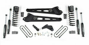 Zone Offroad 2013-17 Ram 3500 (Gas, Including 6.4L Models) 4in Radius Arm Suspension Lift System. The new Ram 3500 gives new meaning to inHeavy-Dutyin. Holding true to that we have developed a lift system centered around two new massive radius arms to replacement the factory arms. The new arms are fully boxed, internally gusseted and designed to bolt in the factory location while adjusting the suspension geometry for 4in of lift. The arms utilize extra large, greaseable bushings at the frame and are designed to use the factory alignment cams at the axle. They are formed for maximum tire clearance. Lastly, they just flat-out look cool and are a nice upgrade from the standard radius arm drop systems. In addition to the new radius arms, like our other new Ram kits, this system gets progressive rate front coils, track bar relocation and steering correction. Out back there is a lift block and u-bolts to level everything out.