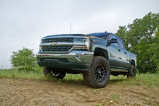 FMVSS No.126 (ESC system test) Compliant - With the popularity of Zone's 6.5in lift kit for the 07-13 GM trucks, the engineers at Zone Offroad Products have designed the new 2014-17 kits to retain many of the great features customers have comes to expect with fitment for the new electronic power steering on the 2014-17 trucks. The system includes a pair of fully boxed heavy duty crossmembers and robust ductile iron steering knuckles engineered to work with the redesigned steering. A 3-piece differential relocation system is utilized to correct front pinion angle with the center differential brace tying front and rear crossmembers together for a sturdy differential mount. This coupled with the differential skid plate and crossmember brace create an incredibly strong front subframe designed to correct suspension geometry while increasing ground clearance. To retain factory ride quality a pair of bolt-on strut spacers are used to provide lift. These install easily without the need to disassemble the factory strut. Also included in the kit are a pair of CV spacers, brake line brackets, sway bar relocation, and all the necessary hardware to complete the install. To lift the rear and level the stance a 5in flat block is utilized along with longer u-bolts, brake line bracket and nitro shocks. As with all Zone Offroad Products, this 6.5in lift kit for the new 2014-17 Chevy/GMC 1500 trucks is backed by a limited lifetime warranty.