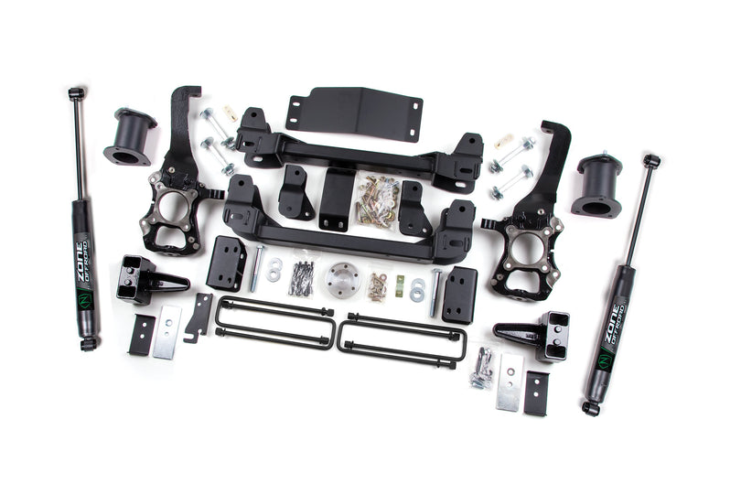 Take your F150 to new heights with this 6" lift kit from Zone Offroad. Kits include everything needed from high strength crossmembers and steering knuckles to strut spacers and rear a block kit to level out the stance. Get the look, performance, and capability your truck deserves with clearance for up to 37" tires.