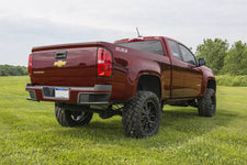 Zone Offroad 2015-19 Chevy Colorado/fits GMC Canyon 5.5in Suspension Lift. This new suspension system for the redesigned Colorado has passed the FMVSS126 test for stability control compliance. To properly lift the new Colorado/Canyon suspension 5.5in, we started with new ductile cast iron steering knuckles. The new knuckles position the critical steering and control arm mounting location and work in harmony with the heavy-duty fabricated crossmembers. Along with new crossmembers, the provided differential drop brackets lower and reposition the front differential for correct CV shaft angles and still allow for use of the factory front driveshaft. Speaking of the front driveshaft, a spacer is included to adjust the length and retain optimum CV joint position. A full width differential skid plate protects the relocated differential from the underside and ties the front and rear crossmembers together. Moving up, the factory struts are retained and relocated with top spacers to gain the full 5.5in of lift. The top spacers do not require any strut disassembly and properly angle and position the struts to eliminate binding through wheel travel. Extended sway bar links, bump stop extensions and brake line relocation are also included to make this a complete kit. In the rear, a new block and U-bolt kit provided 4in of lift to level out the rear with the front. Rear Zone Hydro or Nitro shock options are 10.