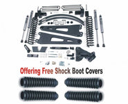 The Zone Offroad 6in radius arm lift systems comes complete with everything needed to complete the install allowing for improved ride quality and performance with clearance for 38in tires. Up front the truck will receive a full length replacement coil springs designed specifically to offer improved on-road/off-road performance with the weight of the diesel Super Duty (gas truck kits will be 10 soon). To reposition the front end and correct caster a pair of heavy duty replacement radius arms that bolt in place of the factory stamped steel arms. These arms are built from high strength 1/6in steel, boxed and fully welded with large 2.5in greaseable bushings to isolate road vibrations. Steering correction comes from a forged drop pitman arm to improve operating angle while a massive 1/6in steel fabricated track bar drop bracket is used to recenter the front end and keep the steering linkage angles in phase for predictable handling. Also included for the front of this 6in lift kit are sway bar relocation brackets to correct sway bar operating angle, brake line drop brackets to reposition the factory lines, bump stop extensions to control suspension compression and new steering stabilizer mounts to improve operating angle for more effective use of the supplied larger nitro steering stabilizer cylinder. In the rear these kits retain the factory leaf springs and overloads so your truck maintains its tow capability. In place of the factory lift blocks Zone Offroad supplies a 6in rear block and u-bolt kit to level the stance. F250 models with the 2-leaf main rear springs also receive an add-a-leaf kit for an additional boost to level the stance. Rear brake line brackets are supplied. As with all Zone Ofroad kits these include Factory Protection Plus for peace of mind wherever you may adventure. Get more from your 2017 Super Duty with room for 38in tires.
