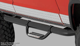 - Constructed of 3” round tube and black powder-coated, each bar acts as an entry step into the vehicle as well.