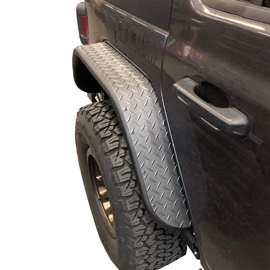 Designed to replace the original flares, Warrior’s new Rear Tube Fender Flares mount into the existing fender wells. Constructed of 1.5" steel tubing, these beefy frames are a perfect complement to our Tube Doors and Platform Roof Rack. The outer mounting and frame of the flare comes in a black powder-coated finish while the flares’ top plate comes in four varieties to match other Warrior Body Armor. They're available in Polished Aluminum Diamond Plate, Black Powder Coated Aluminum Diamond Plate, Smooth Black Powder Coated Steel, and a Raw Uncoated Finish; for paint matching purposes. All fender flares are sold in front and rear pairs.