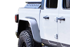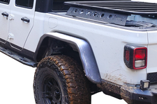 Designed to replace the original flares, Warrior’s new Rear Tube Fender Flares mount into the existing fender wells with minimal or no drilling. Constructed of 1.5" steel tubing, these beefy frames are a perfect complement to our Tube Doors and Platform Roof Rack built for the JT. The outer mounting and frame of the flare comes in a black powder-coated finish while the flares’ top plate comes in four varieties to match other Warrior Body Armor. They're available in Polished Aluminum Diamond Plate, Black Powder Coated Aluminum Diamond Plate, Smooth Black Powder Coated Steel, and a Raw Uncoated Finish; for paint matching purposes. All fender flares are sold in front and rear pairs.